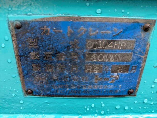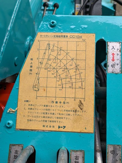 | 消息 | トーア製 カニクレーン 連続全旋回・リモコン式 4段ブーム 地上揚程 5.6M 最大 0.98t吊り 荷重計 ブーム傾斜角度計 巻過警報器 油圧回路安全装置 水平器 最大作業半径 4.8M 総重量 1100kg セル1発始動します 本体サイズ 2275L 685W 1170H 動作確認済 アウトリガー シリンダー 4本 OH済 |