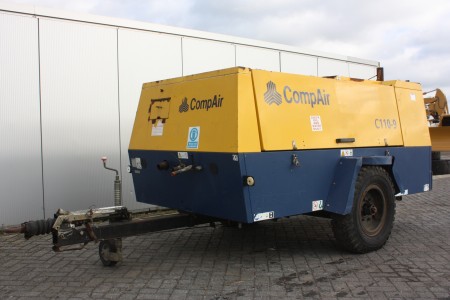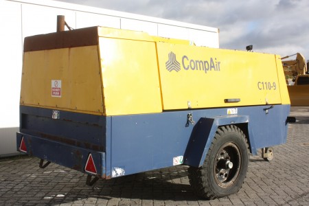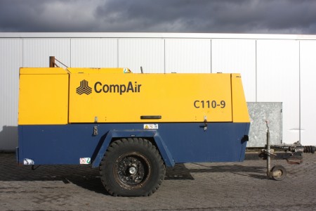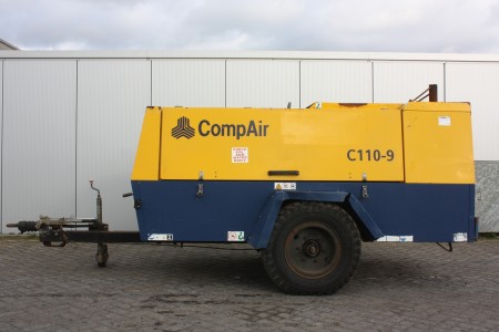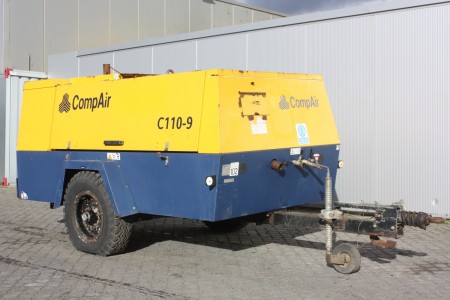 | Description | CompAir C110-9 mobile diesel air compressor, c/w Perkins engine, single axle fast tow, Air Volume Output 11.3 m3/min, max working pressure 9 bar, 4 air outlets. |