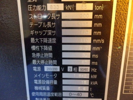 85t テーブル長さ2000 ストローク長200 ギャップ深さ410 ワンタッチホルダー フットペダル付 機械重量5.6t