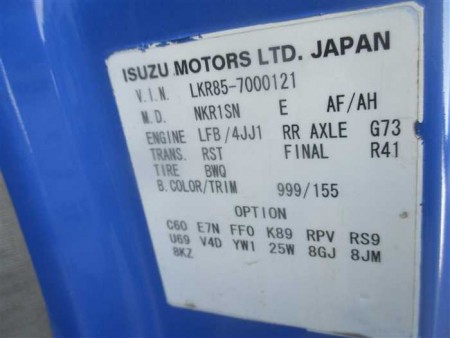 | 詳細 | ENGINE TYPE;4JJ1 走行距離154,569 km 排気量2,990 cc ハンドル右 トランスミッションMT 燃料ディーゼル 駆動方式 2WD <運転席エアバッグ><パワーウィンドウ><エアコン><パワーステアリング> 車両サイズ 169cm×469cm×198cm=15.69m3 |