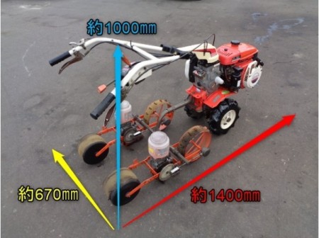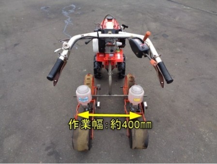 ●フィンガータッチ:入・切 ●ハンドル回動 ●主変速:前進 1・2・3 後進 1 ●副変速:低・高 ●播種間調節:15~30㎝ ●作業幅:400㎜ ●ガソリンエンジン:GM180 ●最大出力:5.5馬力