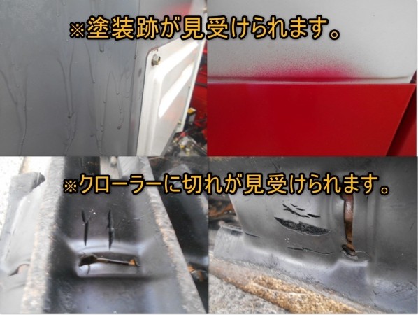 〇24馬力 〇クローラ状態:切れが見受けられます。 〇クローラサイズ:400×40×90 《機能》 〇自動水平 〇こぎ深さ(自動) 《破損・欠品》 *塗装跡が見受けられます。